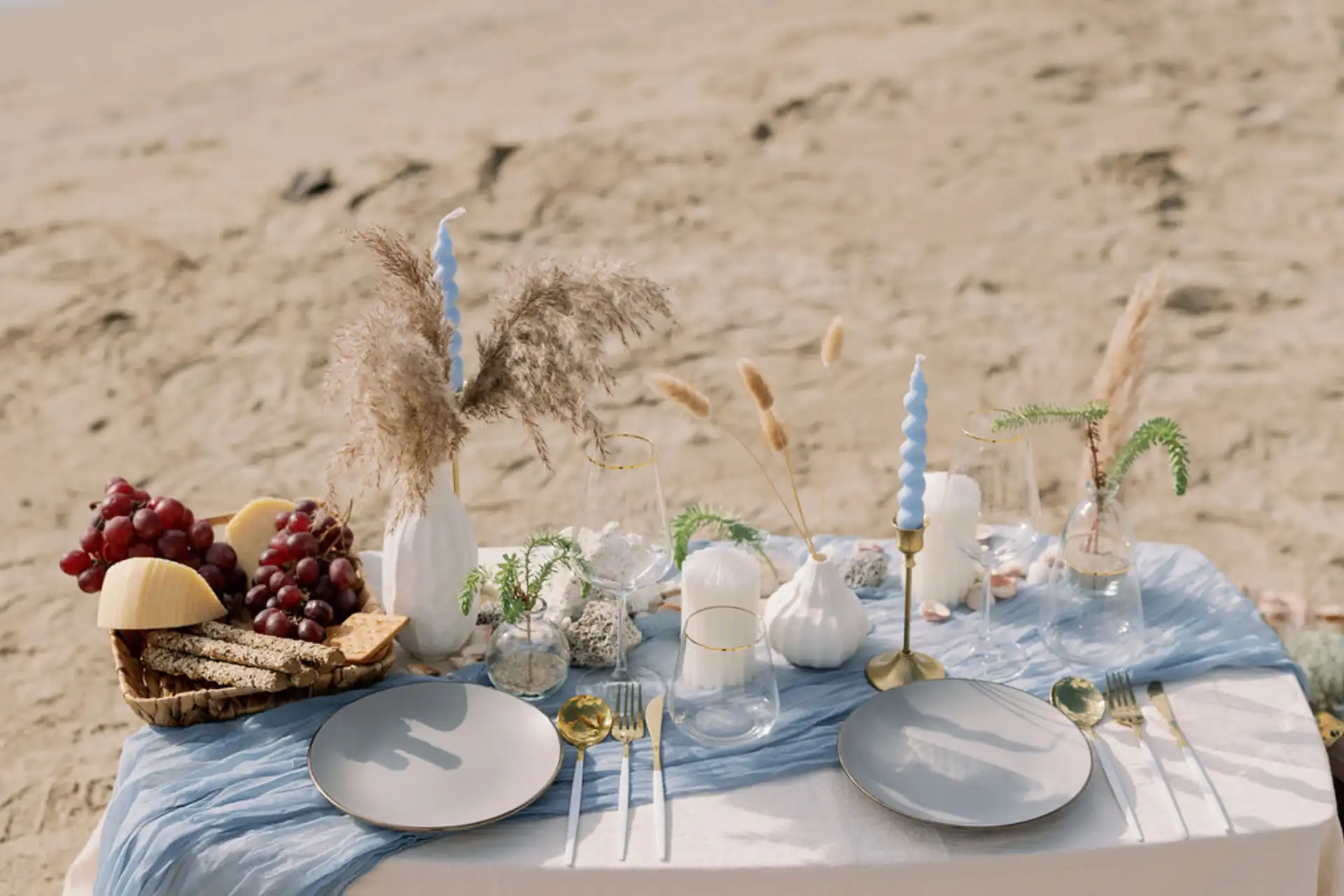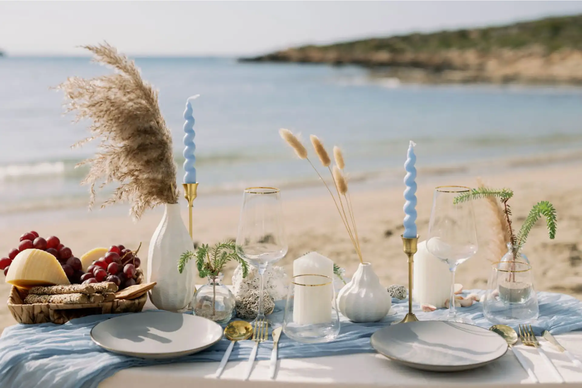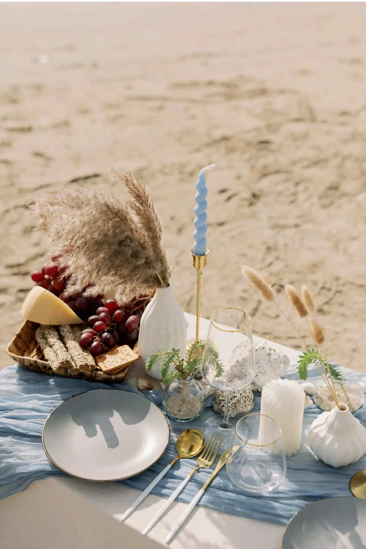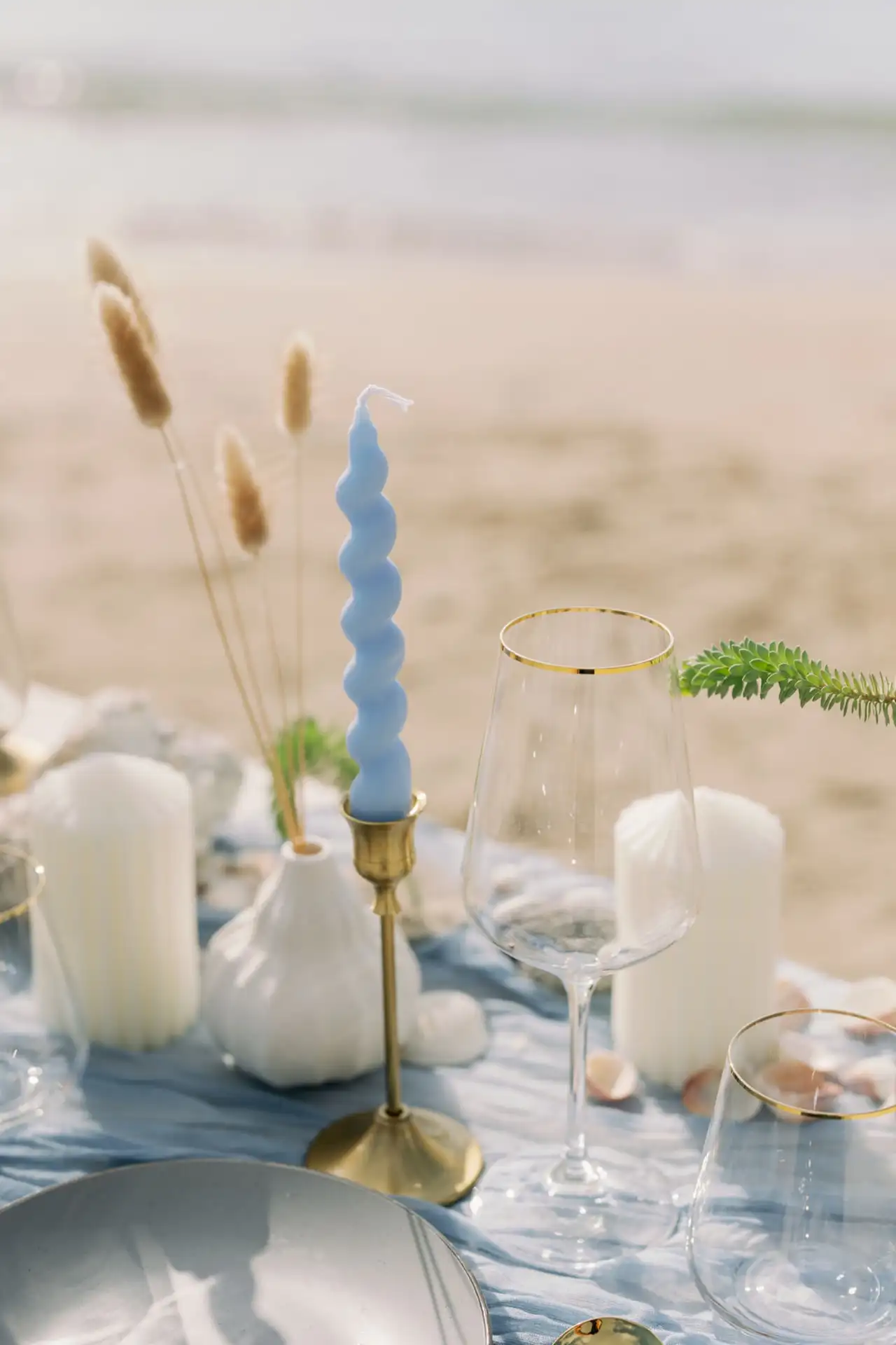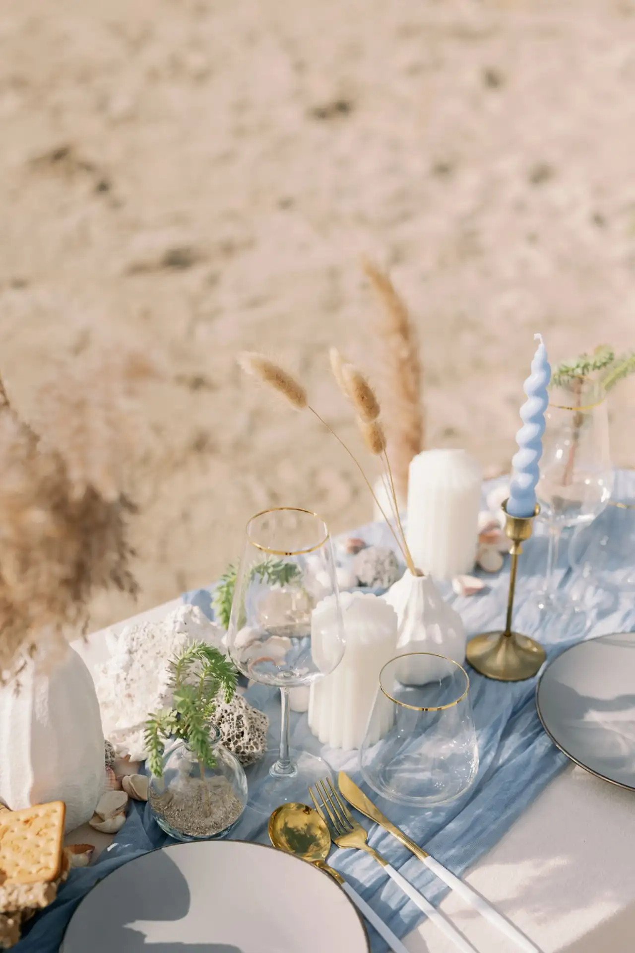 A romantic table for two is positioned right by the water’s edge, where the sand kisses the sea. It’s elegantly draped with a flowing white linen cloth, fluttering in the breeze like gentle waves. The color scheme of deep blue, aqua, and pearl white sets a calm and intimate atmosphere.