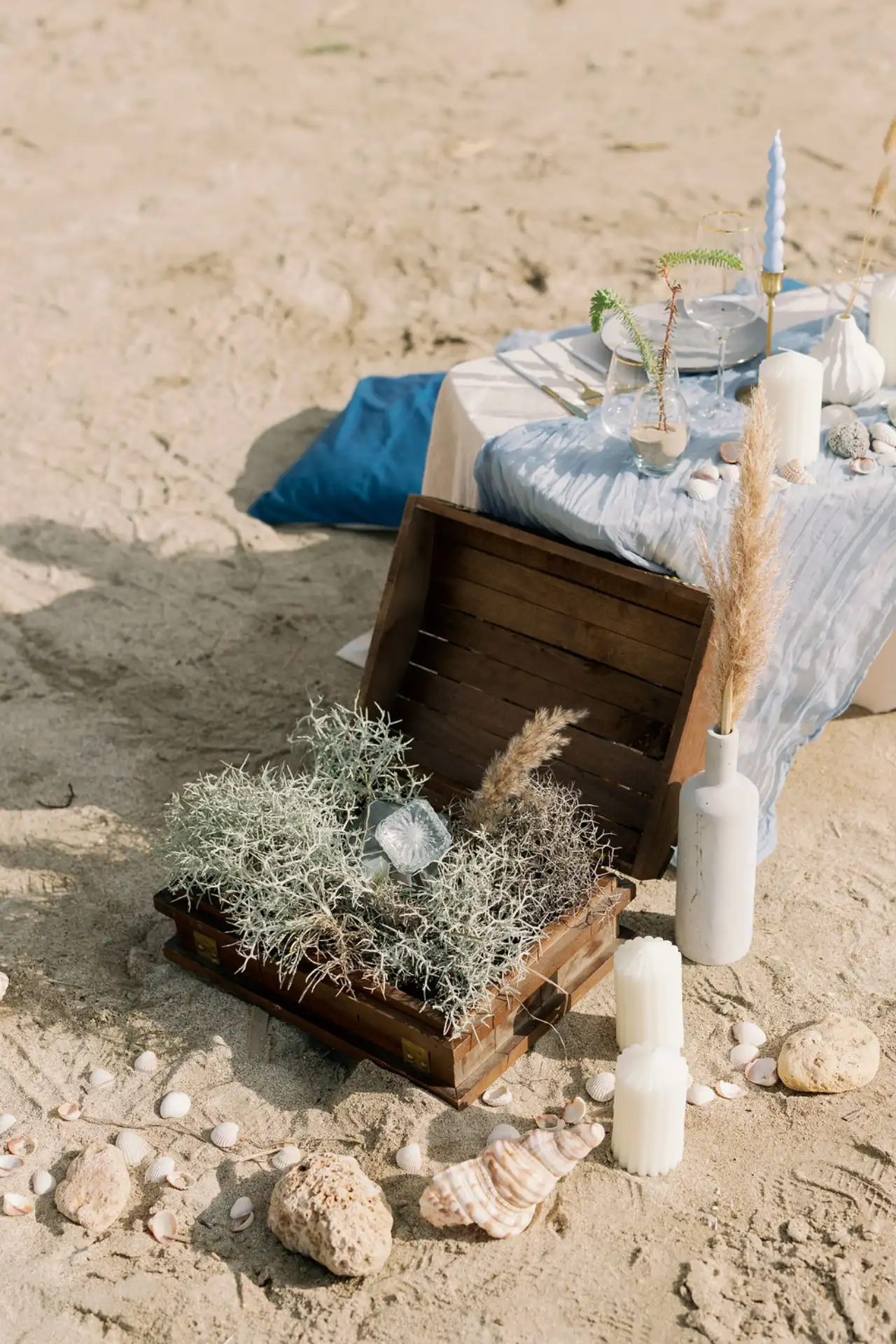 This proposal unfolds on a hidden beach, where the soothing sound of the waves creates the perfect backdrop for a truly memorable moment. Drawing inspiration from the ocean’s allure and mystery, the setting is adorned with soft shades of blue, seashells, and minimalist decor that reflect the ocean’s treasures.