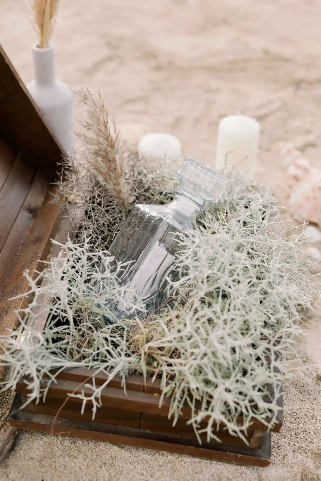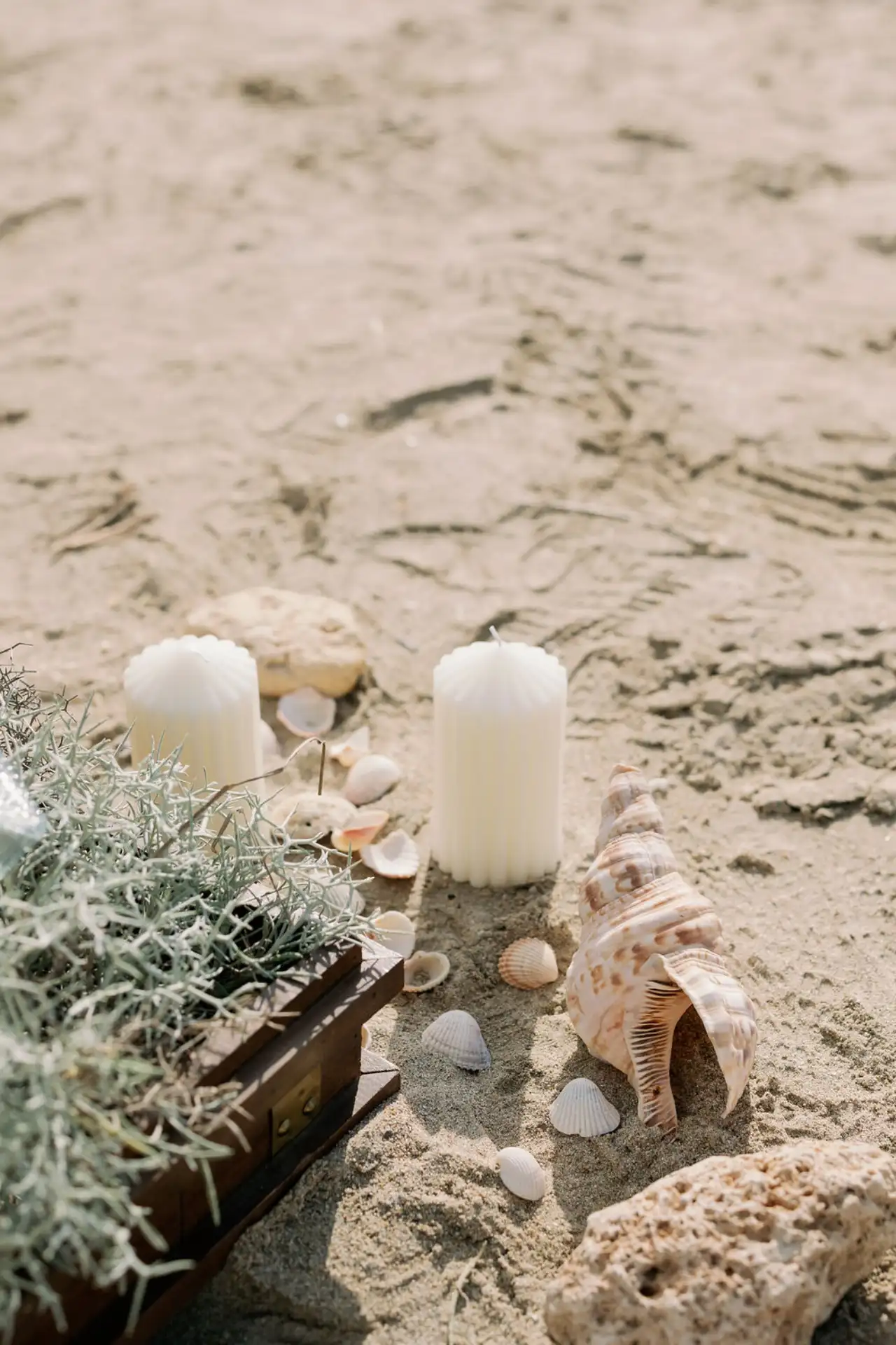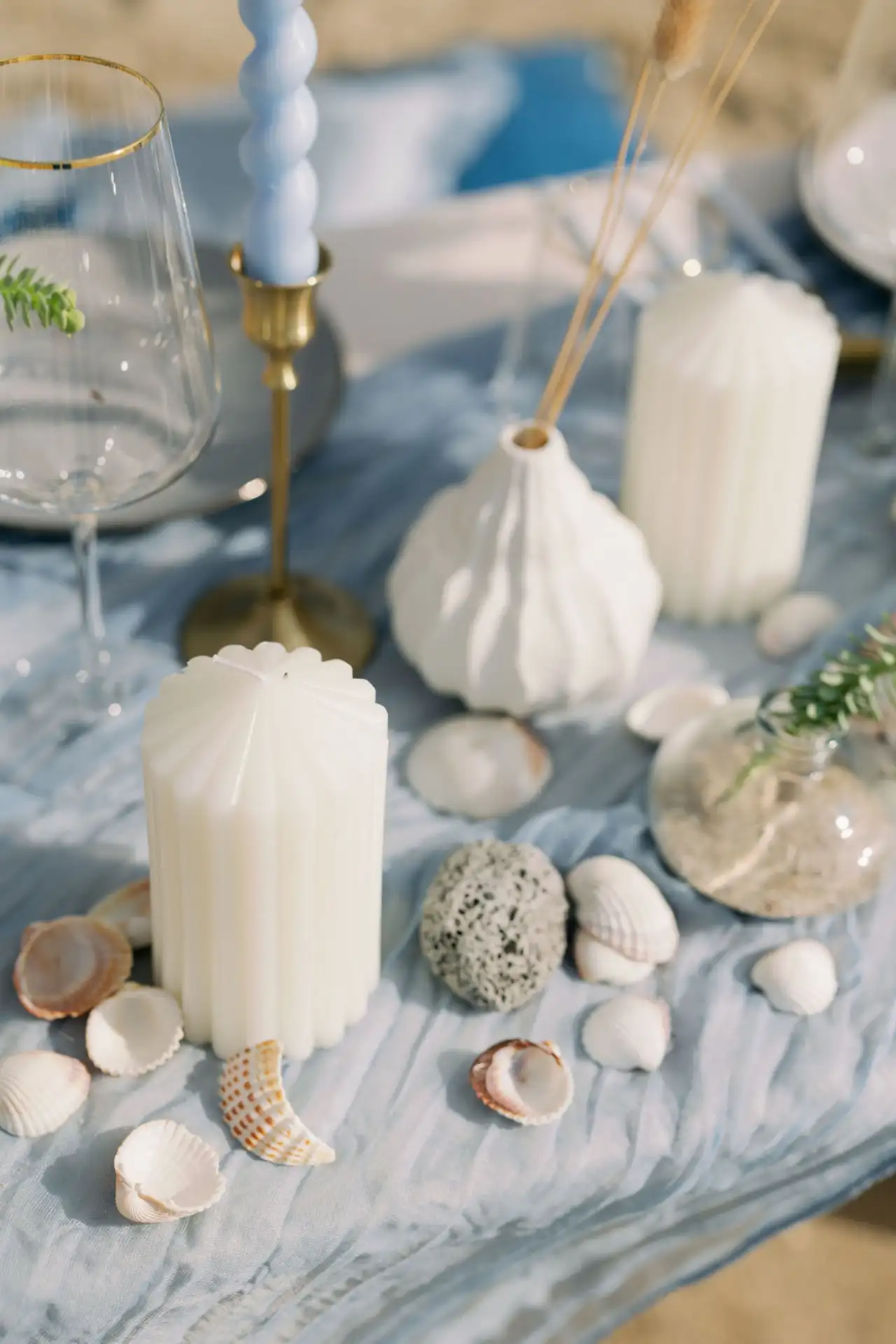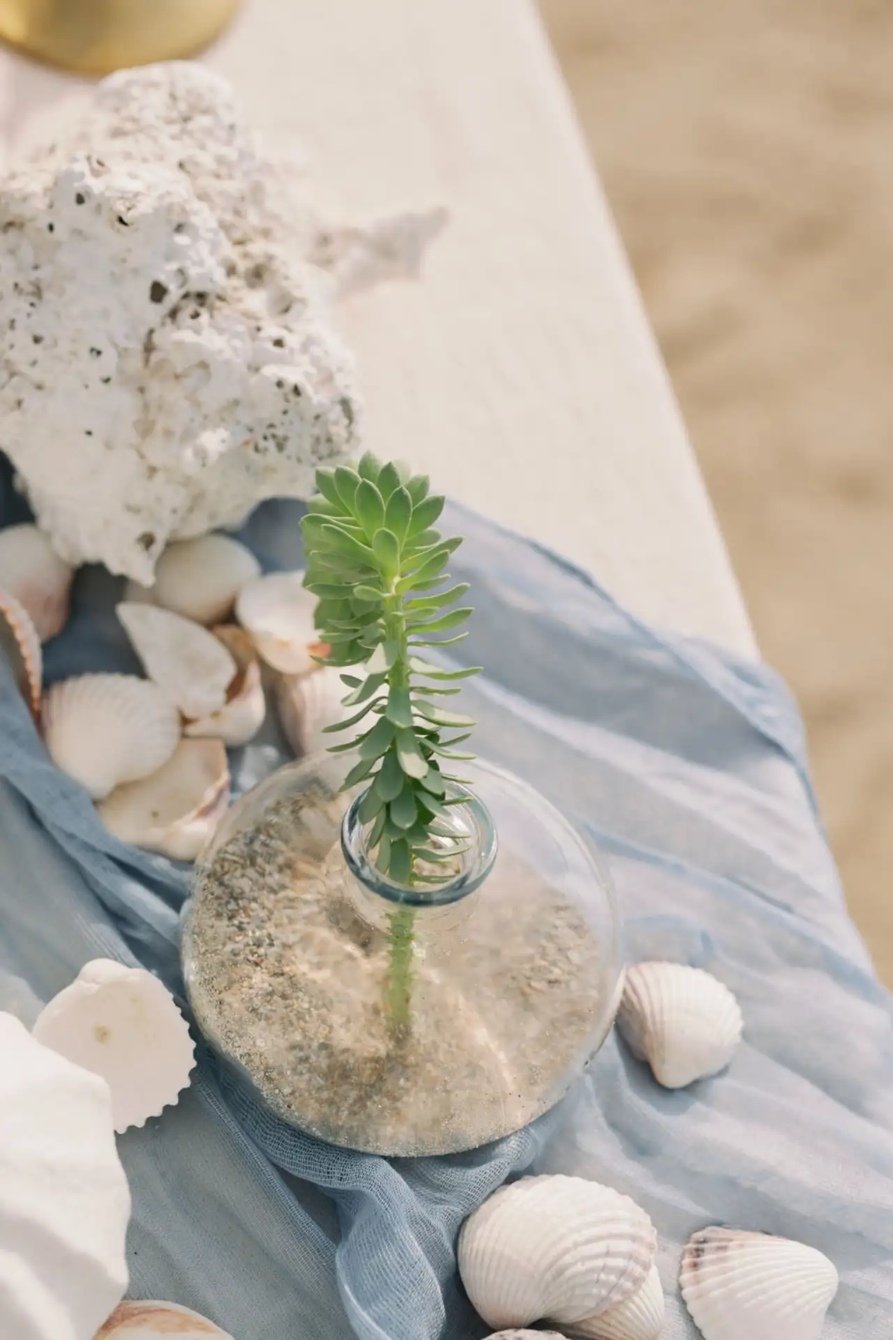 The table is beautifully decorated with delicate shells, driftwood, and a simple white ceramic vase that resembles a piece of coral shaped by the sea, all echoing nature’s artistry. Yet, within this elegant simplicity lies a hidden surprise.
