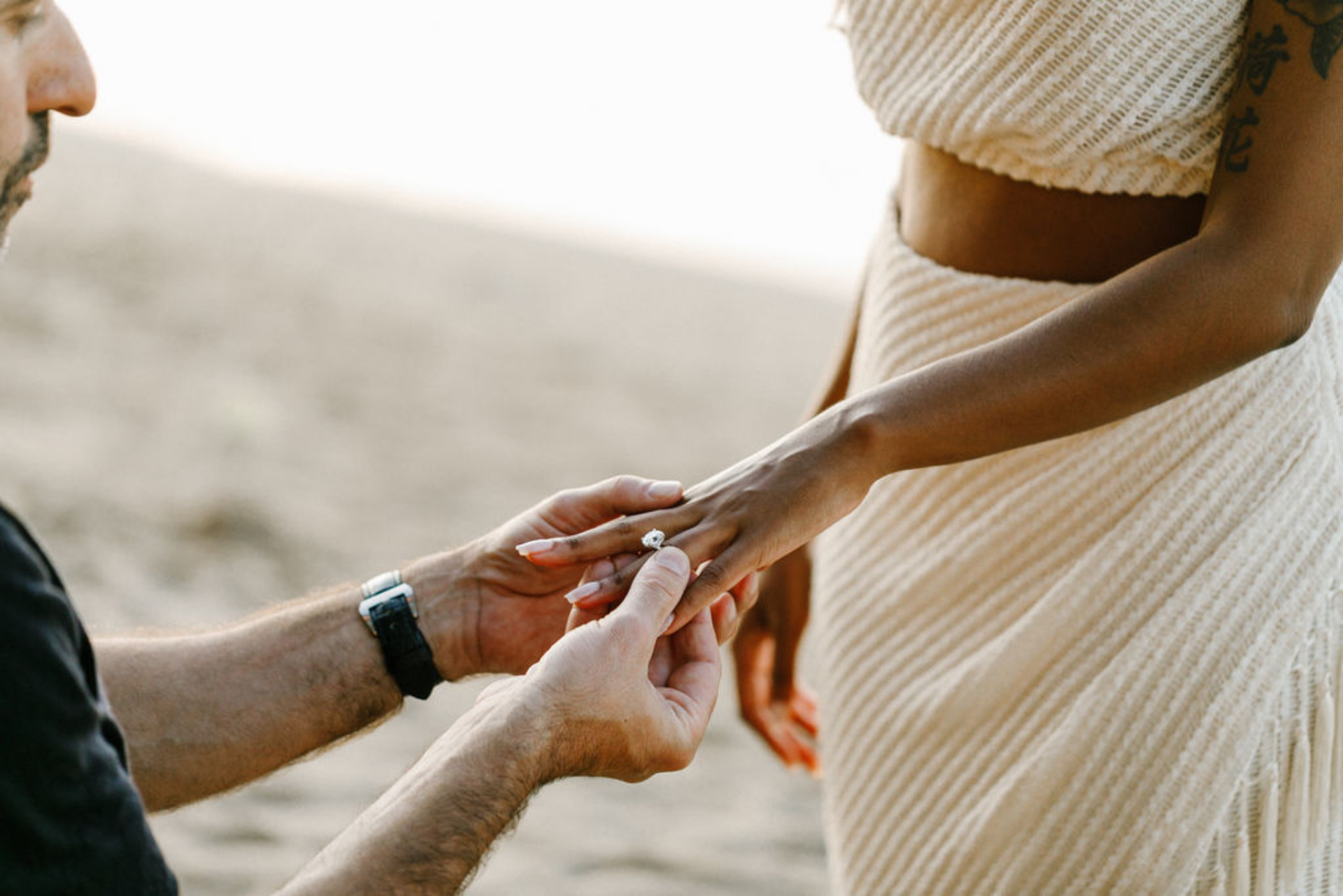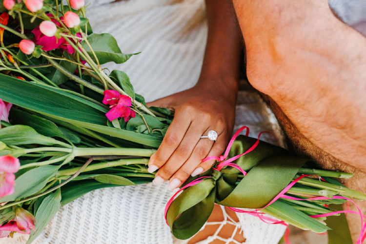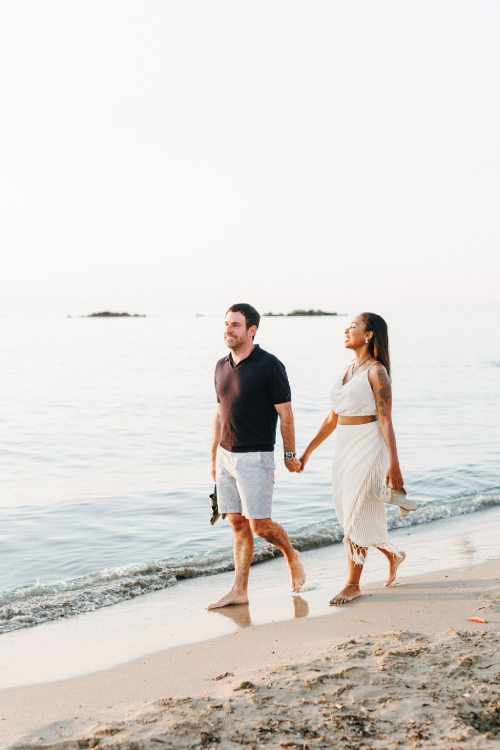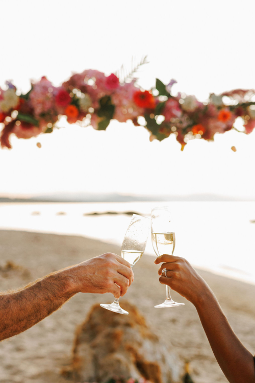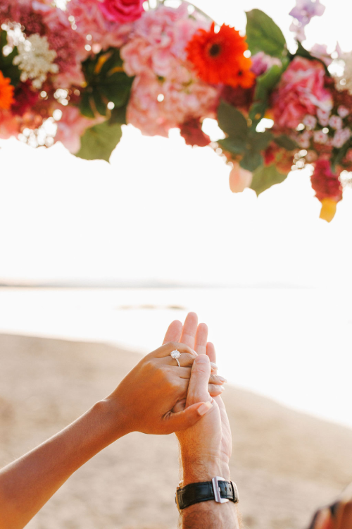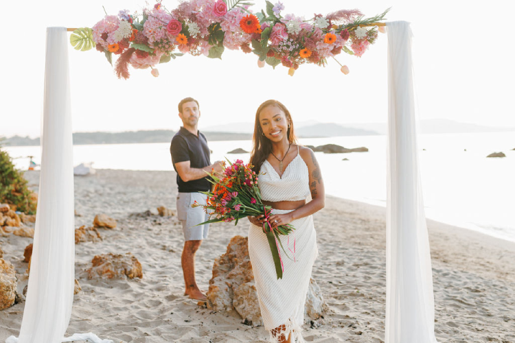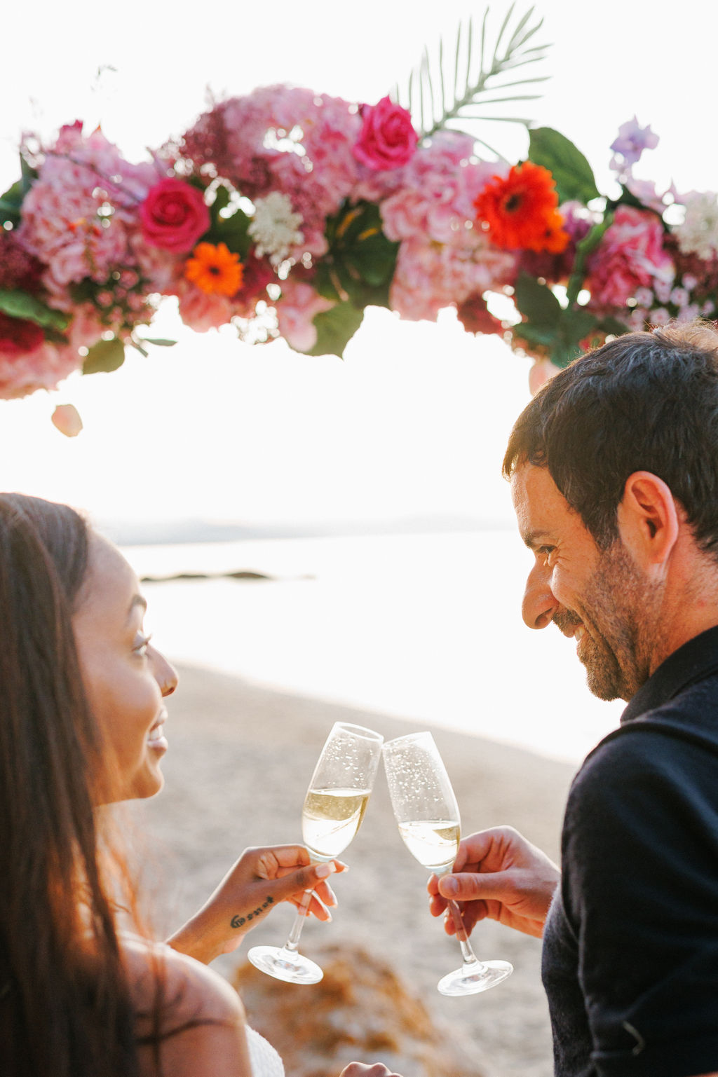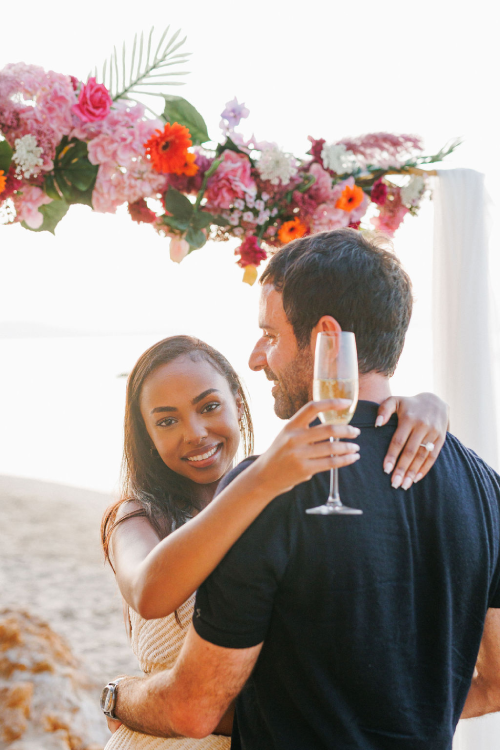 To honor that spark, Dimitri planned a proposal on the soft sands of Chania Beach. Beneath a custom floral arch — vibrant with roses, peonies, and summer color — he asked her to write the next chapter of their story with him.