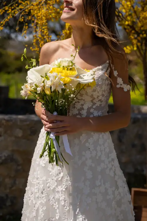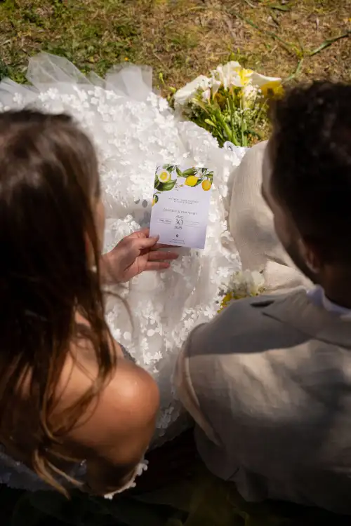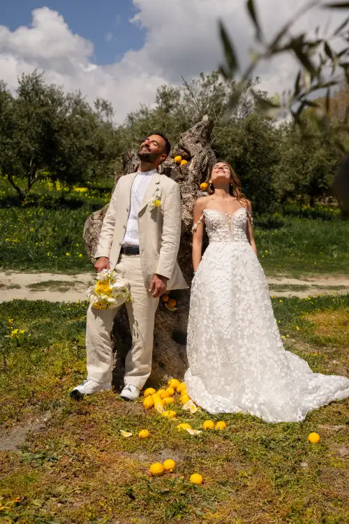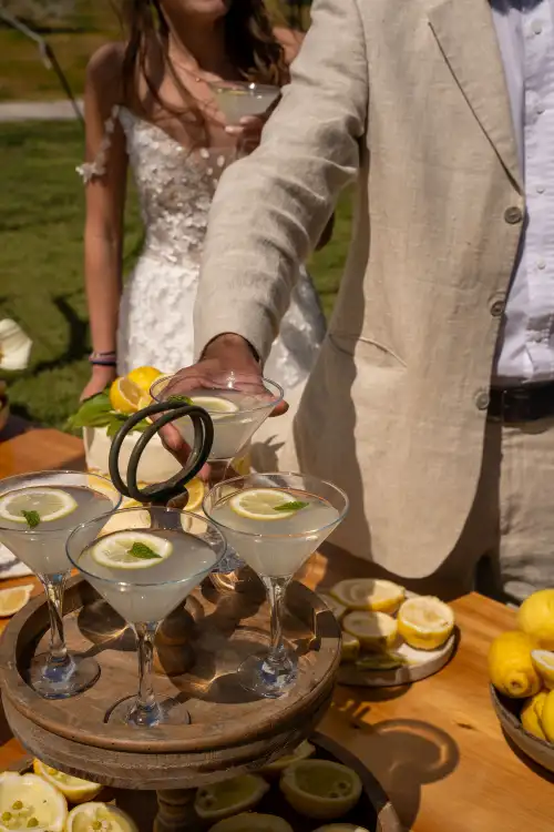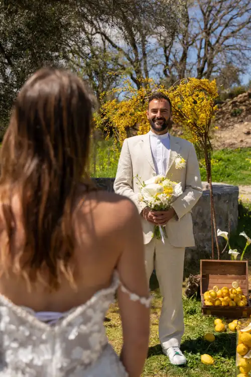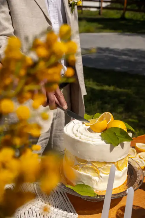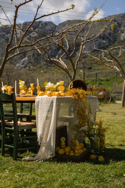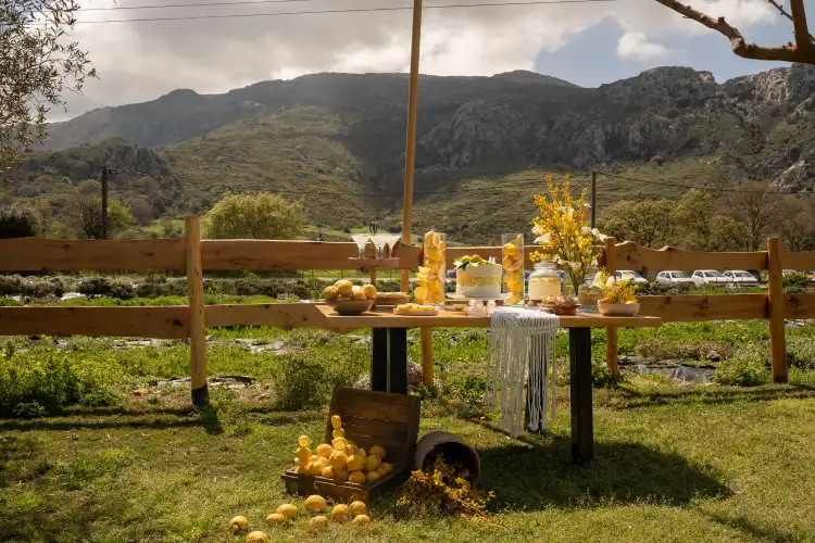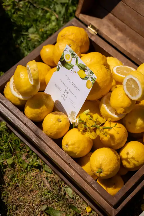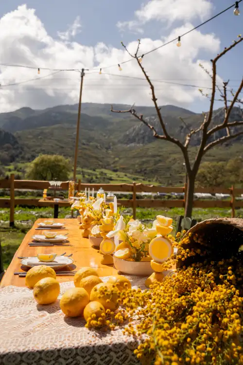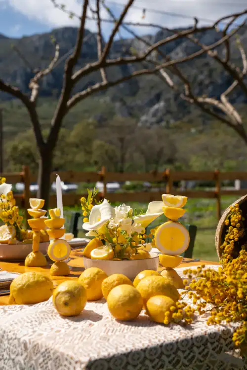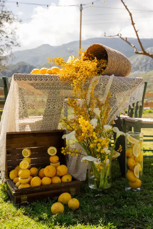 Set against the serene backdrop of rolling hills and a clear blue sky, the wedding table is a vision of natural elegance and joyful simplicity. Adorned with sun-bright lemons, soft white blooms, and golden mimosa, it radiates a sense of rustic charm and Mediterranean warmth. Every detail—from the halved lemons perched beside glowing candles to the cascading floral basket—invites guests to savor the beauty of nature and the joy of togetherness. This lemon-themed decoration tells a story of light, love, and timeless celebration under the open sky.