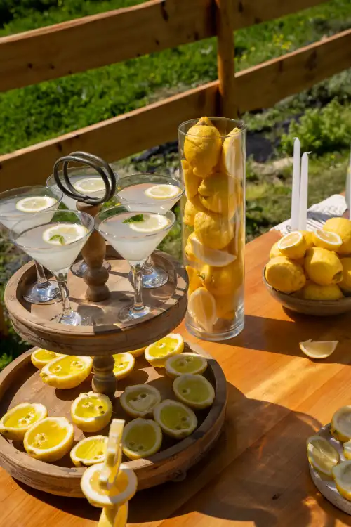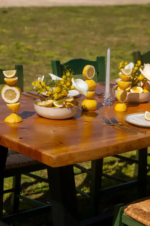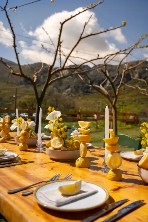 Soft candles are nestled among the fruit and flowers, ready to glow as the evening sets in. The table settings are minimal yet refined—white plates paired with neutral napkins and simple silver cutlery. Lemon wedges rest on each plate, tying the whole theme together with cohesion and charm.